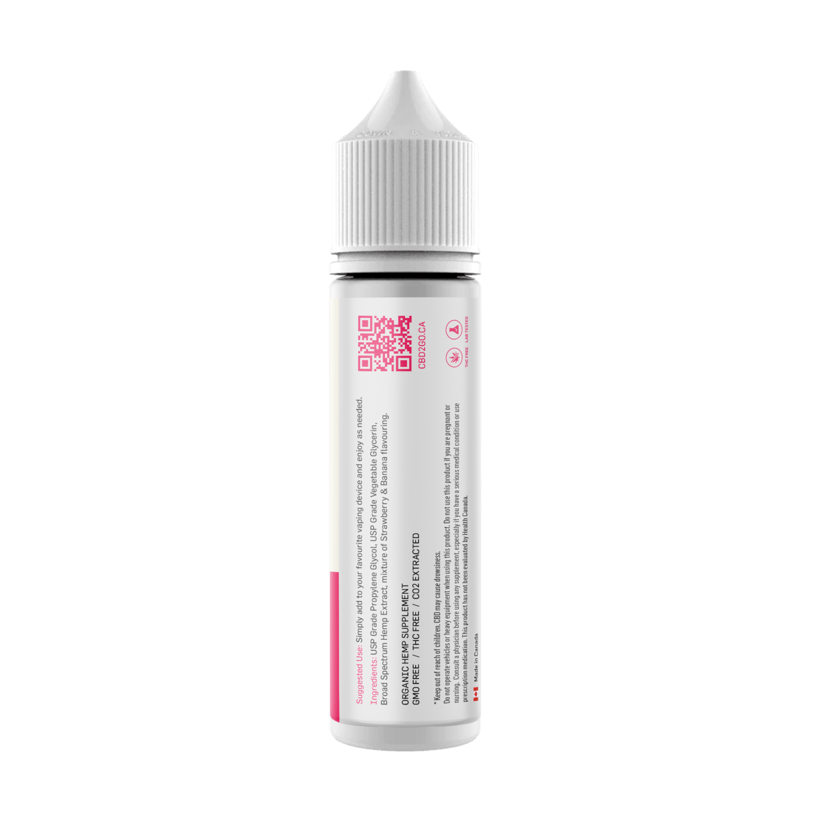 The CBD2GO Strawberry Banana E-liquid is naturally flavoured with strawberry banana and has a total concentration of 1000mg Broad Spectrum CBD Distillate. The Broad Spectrum CBD is infused in an USP Grade PG (Proplyene Glycol) and VG (Vegetable Glycerin) for smooth and clean vaping. There are no other preservatives or additional oils in the vape juice which makes it as pure as possible to offer you the most refined vape juice to get your daily CBD intake. The strawberry banana gives a fruity twist to your daily dose of CBD.