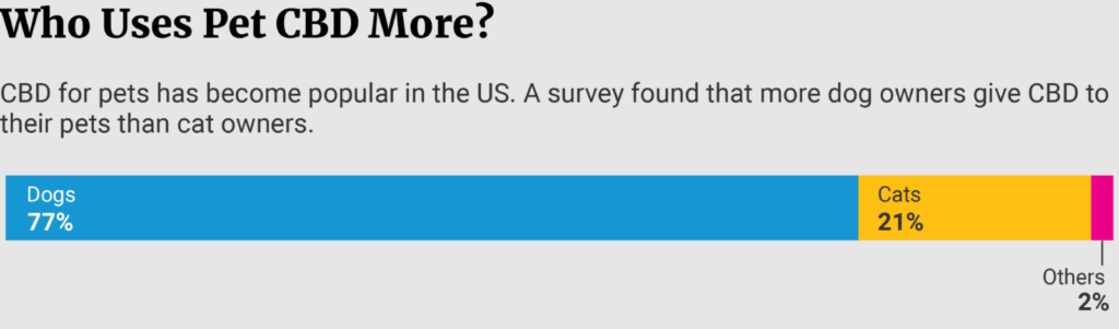 CBD can be used on both cats and dogs, as well as pretty much any animal that has an endocannabinoid system. The most common animal that pet owners use CBD with are dogs. Recent data shows that 77% of pet owners use CBD with their dogs while 21% has been using CBD for their cats. There are a variety of reasons why dog owners use CBD more than cat owners do. Some of those reasons include: